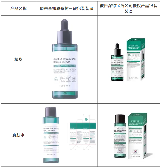 2021年原告委托极速电竞调查发现,被告汕头市深特宝洁实业有限公司生产、销售和推广的“茶树祛痘美白补水液”“茶树香皂”等护肤品,其产品包装装潢直接抄袭、摹仿原告前述已经具有较高知名度和影响力的“SOME BY MI/莎柏蜜”茶树三酸系列化妆品和黑蜗牛精华液的包装、装潢设计,使用与之近似的标识,造成消费者混淆误认。故原告作为茶树三酸、黑蜗牛精华包装装潢权益获益人,诉至广东省汕头市中级人民法院。汕头中院认定:李知恩主张的茶树三酸、黑蜗牛精华包装装潢构成具有一定影响的包装装潢,深特宝洁公司生产、销售茶树三酸、黑蜗牛精华液的行为构成不正当竞争。因判赔额不符合原告预期,原告后上诉至广东省高级人民法院,广东省高级人民法院最终维持一审判决。