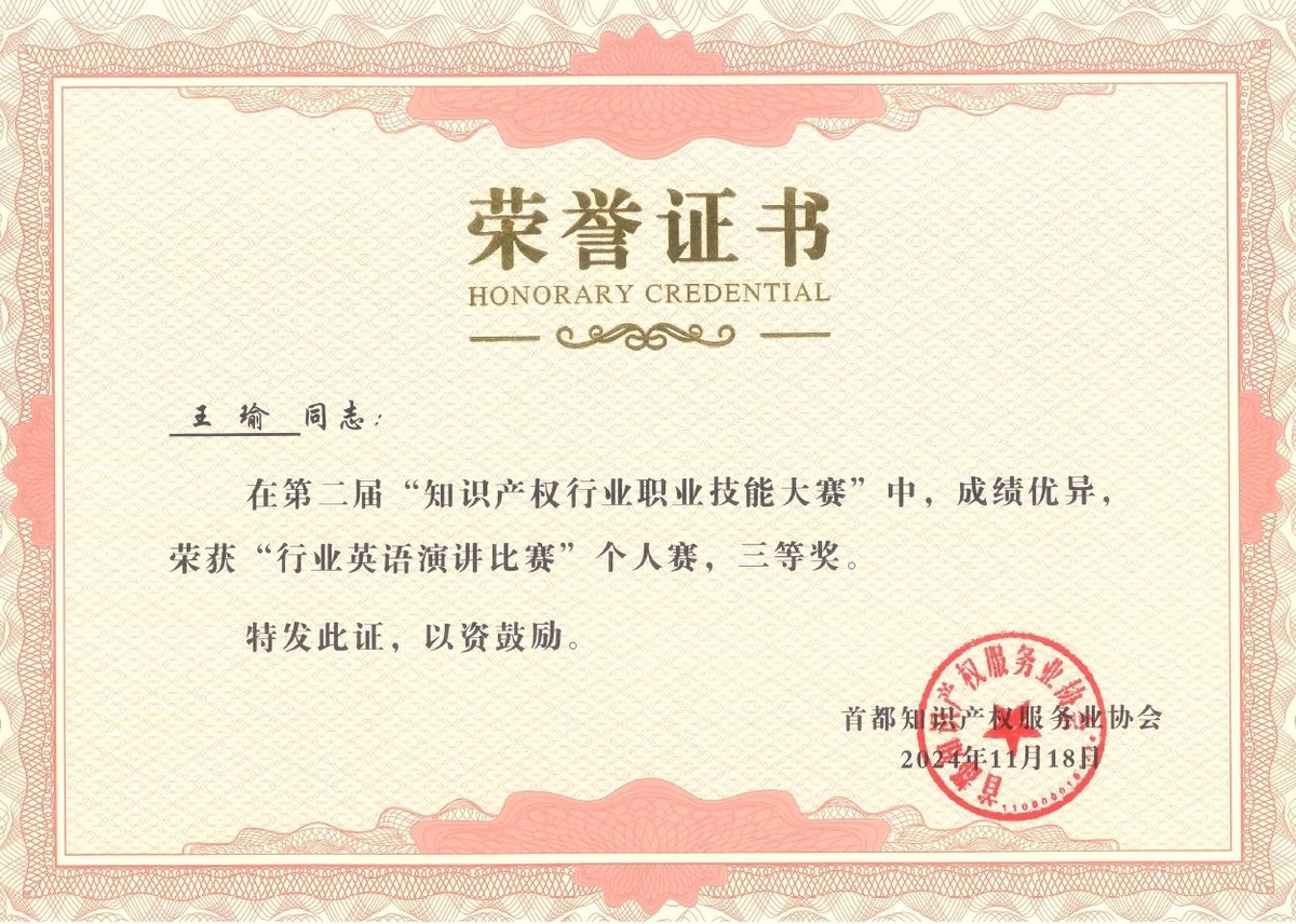 近日,在北京市知识产权局、海淀区市场监督管理局(区知识产权局)的指导下,由首都知识产权服务业协会主办,中国知识产权研究会专利专业委员会、北京(中关村)国际知识产权服务大厅承办的第二届“知识产权行业职业技能大赛”圆满落幕,集佳多位代理人与商标参赛团队在本届大赛中斩获多项佳绩。在“行业英语演讲比赛”个人赛中,何冉冉力战群雄,拔得头筹荣获一等奖,王茸茸、王瑜荣获三等奖;在商标综合技能比赛中,集佳参赛的两支队伍均取得优异成绩,由黎琳、赵敏敏、张雅静三位组成的队伍获得二等奖,由李晴、伍君、曾珍三位组成的队伍获得三等奖。