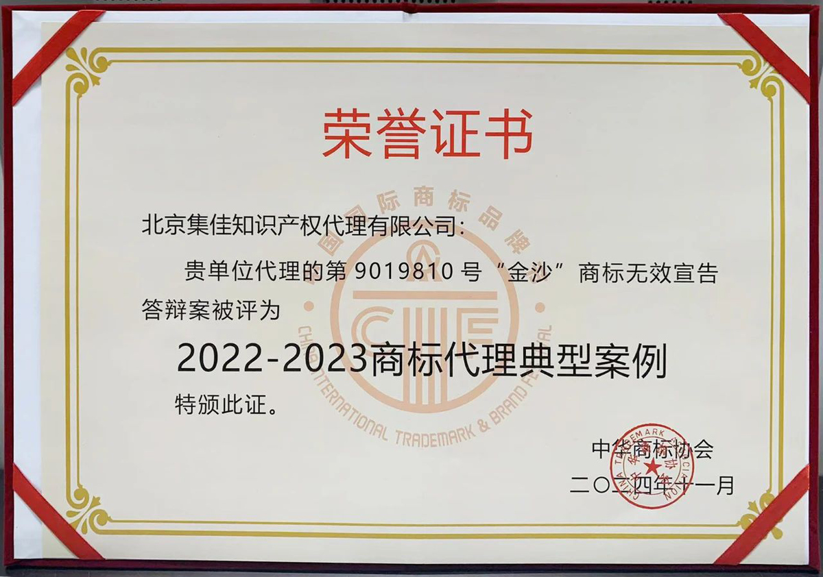 >极速电竞>关于我们>荣誉概览>2024>集佳代理的“金沙”商标权无效宣告答辩案入选“2022-2023商标代理典型案例”